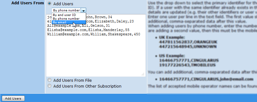 - In the free-form box, enter the details of your end users. Use a separate line for each end user, and comma separate their details. The data on each line must be the same format and in the same order.